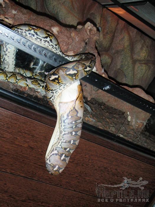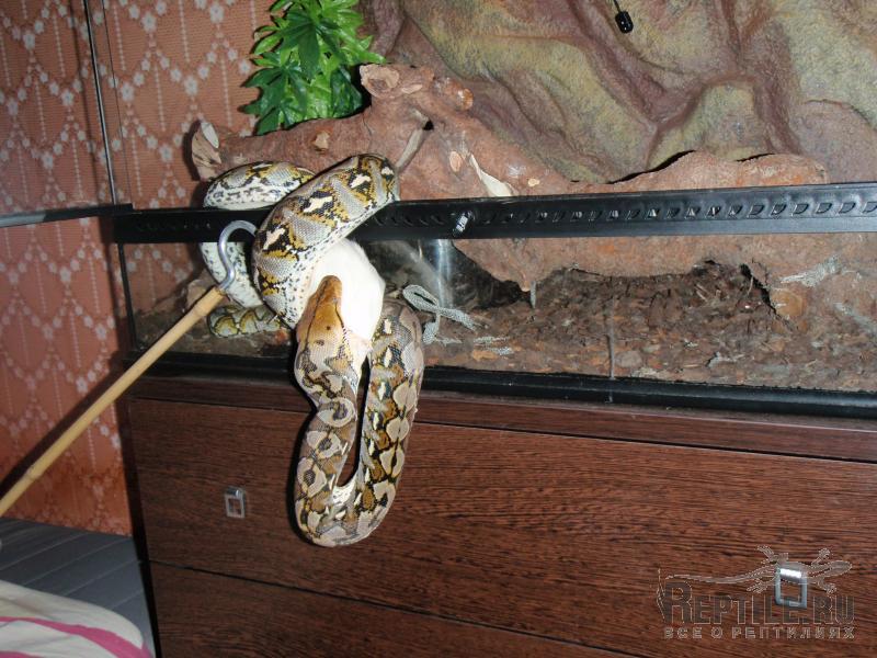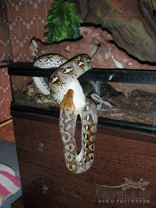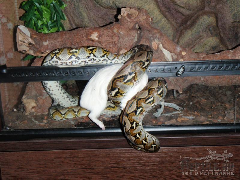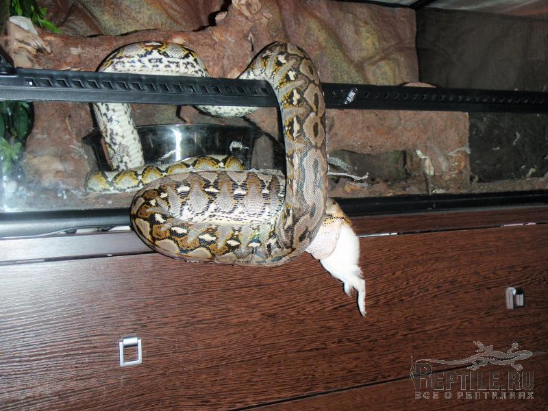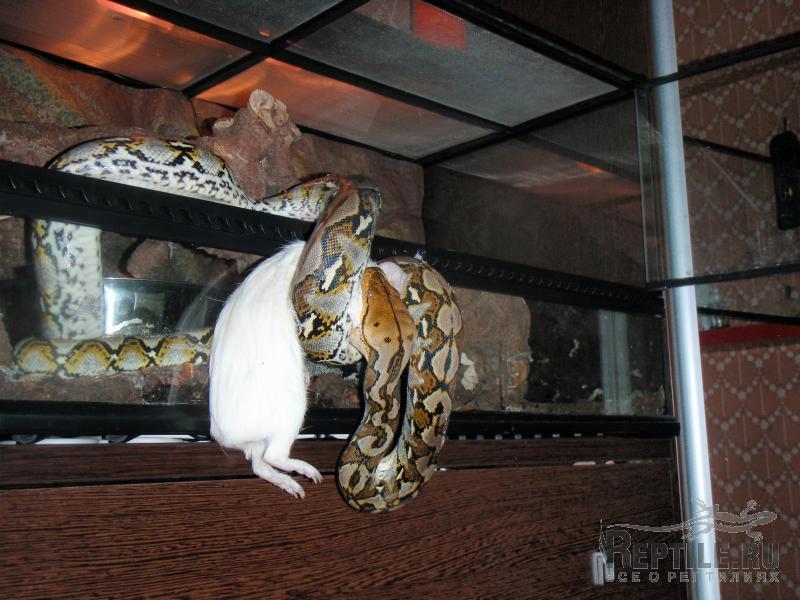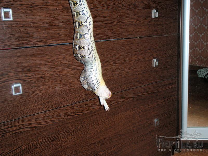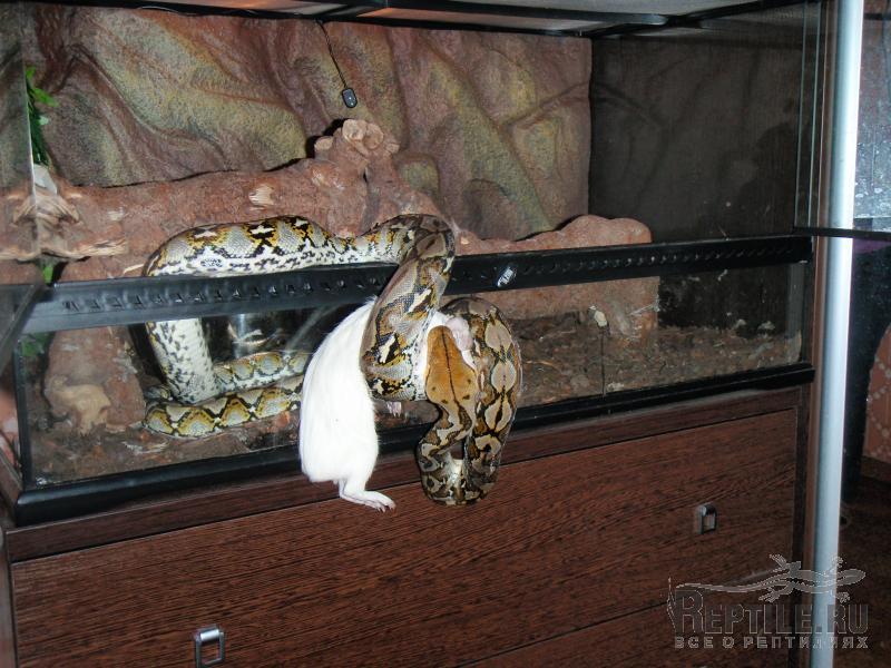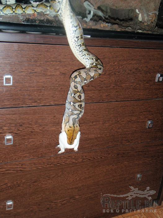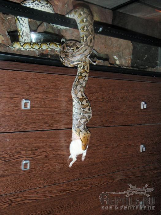 Ну вот, Дед Мороз посетил Тотохин терр и подарил ему на Новый Год вкусненькую свинку Так что можете нас поздравить, мы наконец-то сменили кормовой объект. Змей был крайне счастлив, изменив своей обычной флегматичности прям выпрыгнул из терра на тушку, в итоге пришлось кушать на весу: