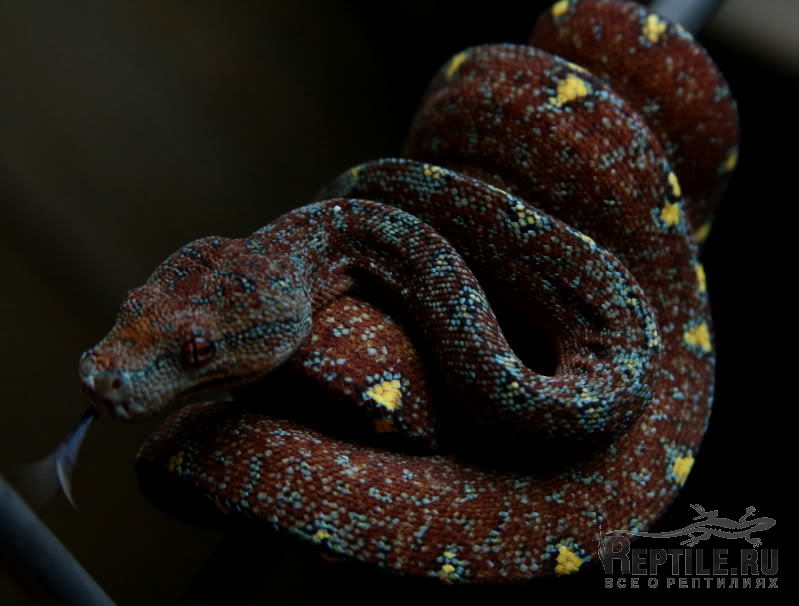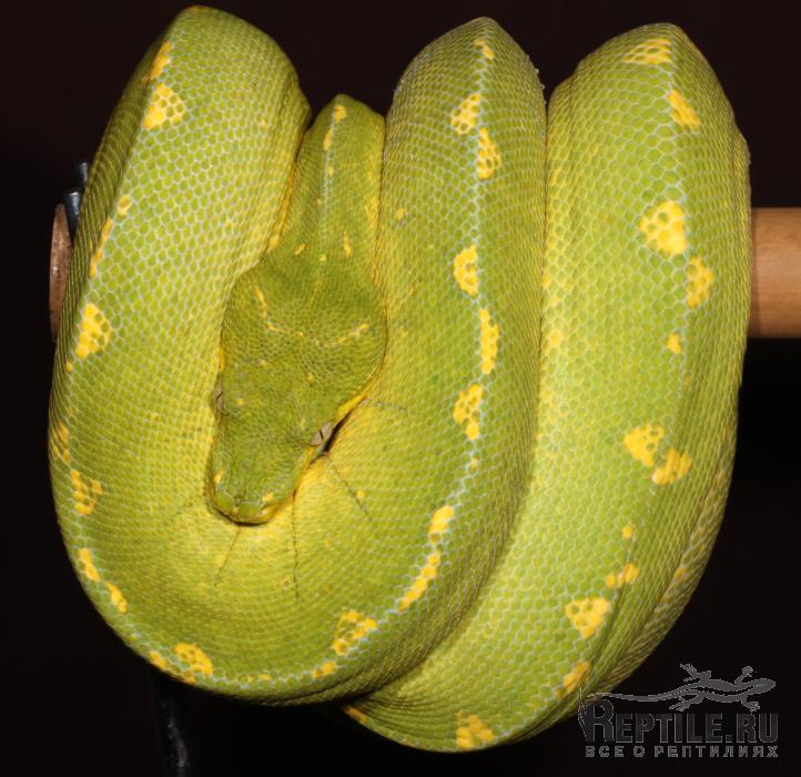 Лет 9-10 назад мне попались две дикие самки. очень крупные, отловленные в окр. поселка Лере, обе были похожи одна на другую, и обе прекрасного. желто-зеленого. солнечного цвета с желтым рисунком по спине. От обеих удалось получить только по одной кладке, и с тех пор ничего подобного мне не попадалось. Первые дети получились обычные довольно темного зеленого цвета.Теперь уже эта линия дала третье и четвертое поколение. С четвертым пока не ясно. а вот в третьем уже появились экземпляры, похожие на то, к чему я стремился все эти годы. Фото получилось не ахти, сделано на скорую руку, по заказу. "Что вышло плохо - видно сразу, ведь я работал по приказу!". Это про фото, а вот питон, по-моему, получился. этой самке, третья генерация. уже почти 3 года. В этом году она уже будет готова размножаться.