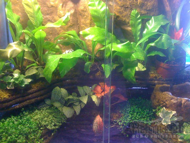имеется акватеррариум 800х550х850.t-25днем,24-ночью.влажность-80-100.свет 12 часов.много влаголюбивых растений.рыбки-гуппи,данио,тетры.есть водопадик небольшой.подскажите,кого туда можно подселить?чтобы растениям не вредили,желательно(но не обязательно)насекомоядного(есть колония мраморных тараканов),хочется днем животинку видеть.