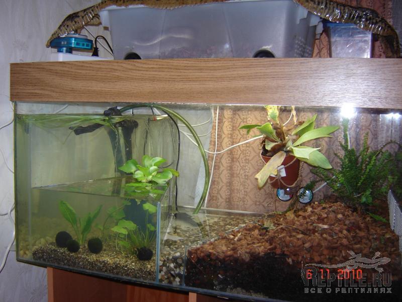 Остальная часть терра каскадно разделена на три части, самая мелкая - купалка для черепахи, средняя - "растительный" аквариум, высокий - безрастительный аквариум. На все три объема - одна помпа/фильтр.