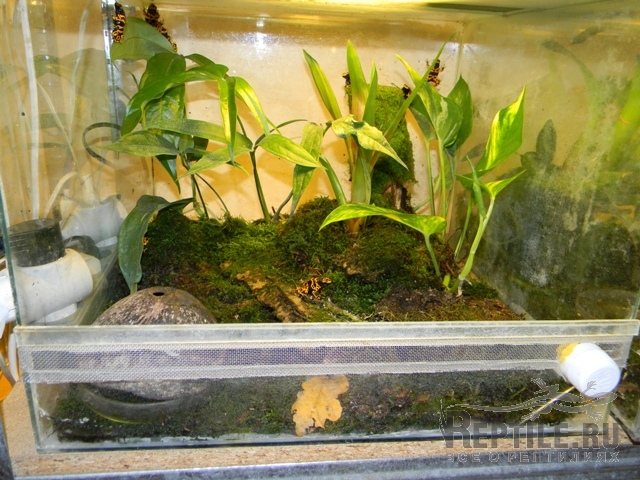 Для покрытия дна террариумов мы используем слой мелкого керамзита, на него слой плотно утрамбованного сфагнума, а дальше кора, живой лесной мох, опавшие листья фикуса и дуба.