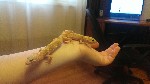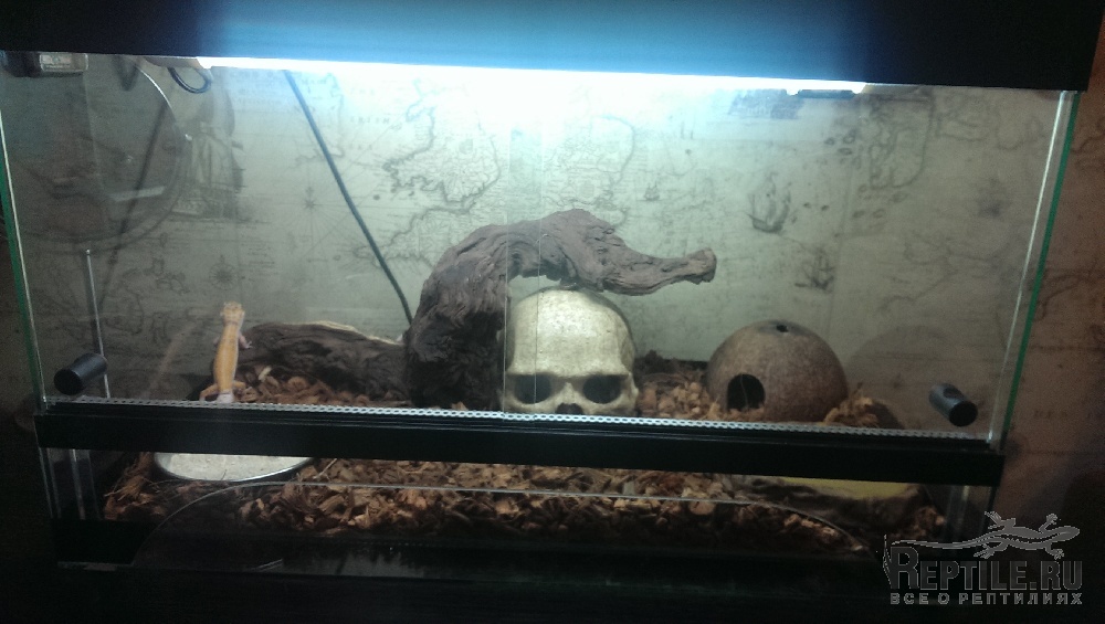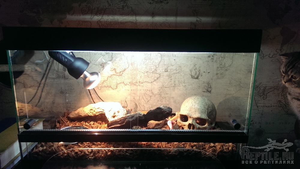 ЭУ дома появились в субботу. Две девочки. Живут в терре 550*300*350. Одно большое укрытие, коряга,поилка, мисочка с витаминами и кальцием. В терре есть две лампы,накаливания и дневного света. Накаливания пока снял,сказали что лучше использовать термо коврик (прилепил). Девочки днем сидят в "черепе", вечером выходят, от еды по понятной причине пока отказываются.Во всем терре t ровно -26°C. Влажность 50%. Одна девочка альбинос,с красными глазками, даже при дневном свете (длинной лампе), шастает с закрытыми глазами, вторая ходит с открытыми. Стоит по-выключать весь свет, красногазка открывает свои зенки. Вопросы: