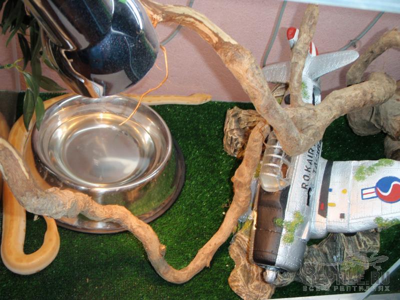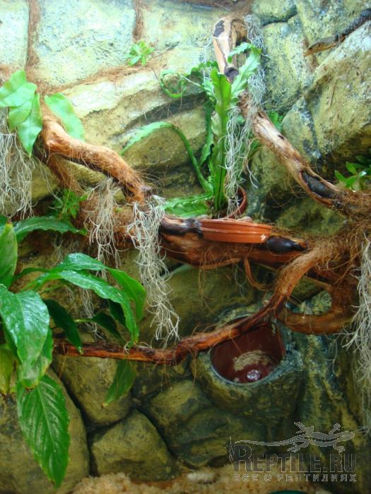 говорит кайфово ))) днем из теплого в холодный домик перебирается. (холодный в левой части за корягами, покупной(из серии с пилкой), а теплый под поилкой), иногда по лианам ползает и на левой коряжке на самом верху в колачек сбивается, а ночью любимое место это светильник )))