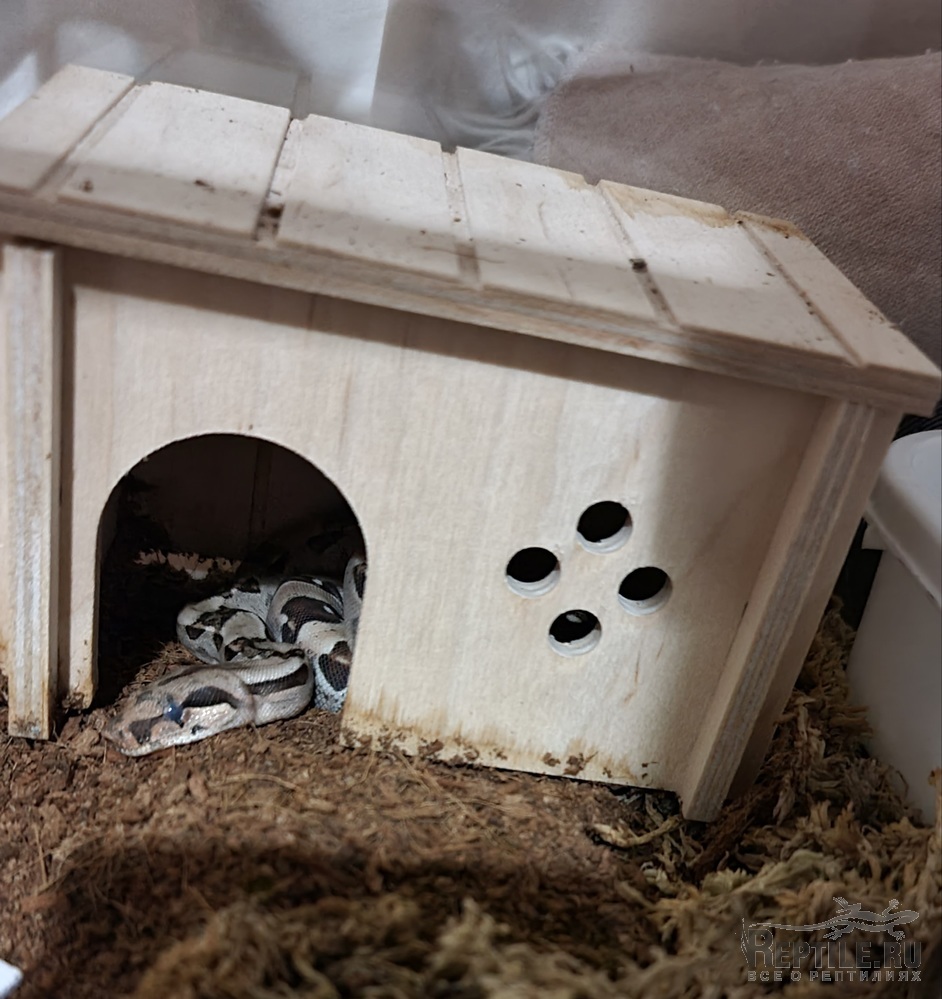 вот так он живёт, термоковрик у него не большой под домиком, но я ему побольше заказала, у нас в городе не было, пришлось заказать. Температура термоковрика 30 градусов,иногда опрыскиваю террариум. До сих пор вот так лежит...