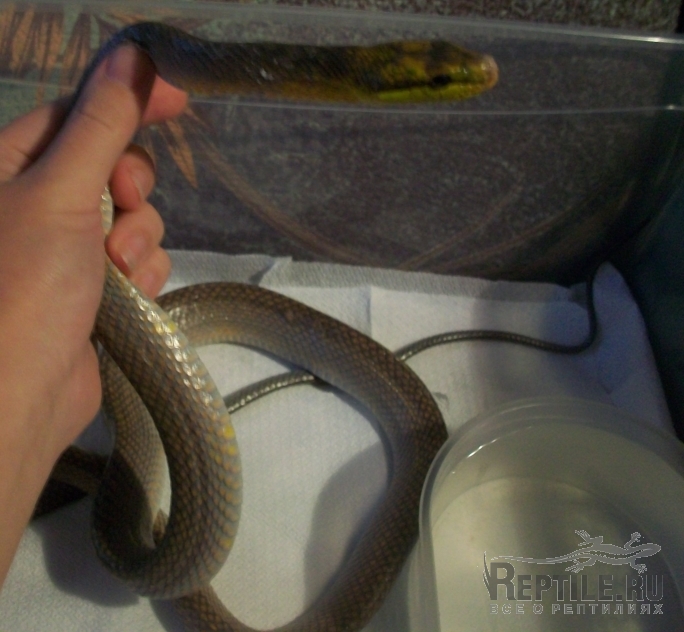 Отдали мне в магазине змею. Сказали, привезли \"бешеное животное\", которое билось мордой о стекло, пока она не покрылась коростой. Т.к. змея не ручная, лечить не стали. Почти полгода(!) животное не ело, жило в литровой \"продажной\" посудине. Придя домой, открыла банку, там оказалась длинная, тонкая змея (около полутора метров), покрытая несколькими слоями старой кожи. Аккуратно отмыла, животина оказалась милым созданием, сильно исхудавшим и ослабленным. Морда изуродована язвенным стоматитом, фотография с наиболее \"презентабельной\" стороны (стоматит слева на всю губу и язва на \"носу\"). Лечить язвы на теле и морде уже начала, но определить змею не могу. Из-за травмы пасти малыш не ест, покормила насильно говядиной, смоченной в яйце (возможно был перелом челюсти, кормлю маааааленькими кусочками и очень aккуратно), но возможно, змее лучше давать рыбу или птицу... На фото не видно редкие бледные хаотичные желтые крапины по телу и слабоватый зеленый отлив возле морды, длина почти полтора метра, пол - мальчик, возраст и родина не известны. Чешуя слабо килеватая (если есть такое понятие) - кончики чешуй немного \"внахлест\". Скорее всего контрабандный природник. Очень хочется спасти змею, подскажите, пожалуйста, название