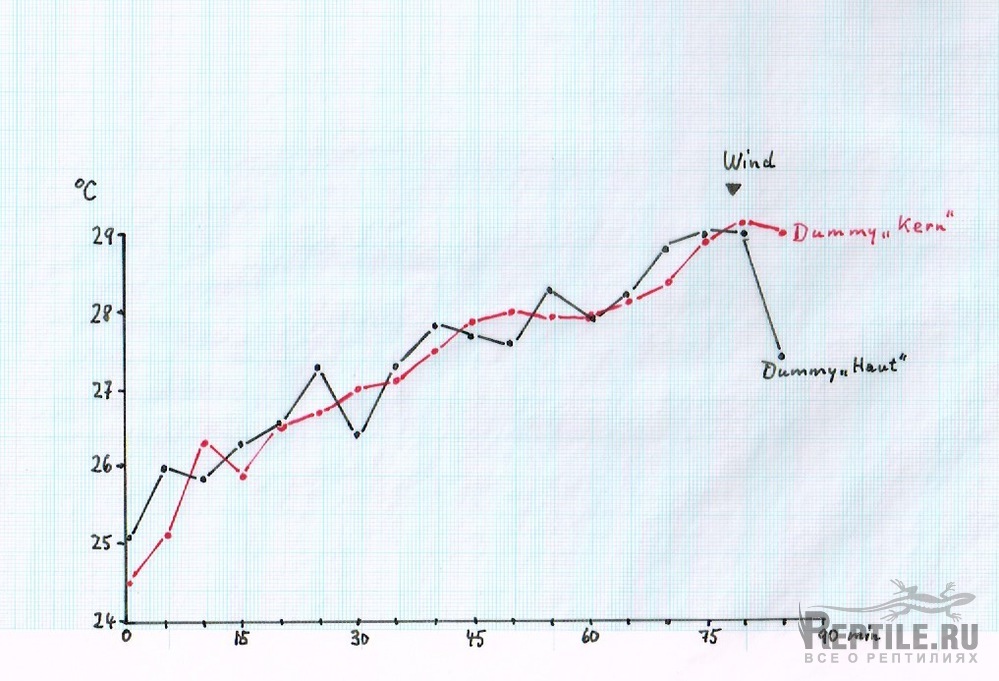 Das Dummy wurde auf den Steinplatten bei den Eidechsen aufgestellt und die beiden Werte in 5 min Abständen notiert. Das Diagramm zeigt ein eng paralleles Ansteigen der Temperaturen, mit gelegentlichen Überschneidungen durch Windeinwirkung (Abb.3).