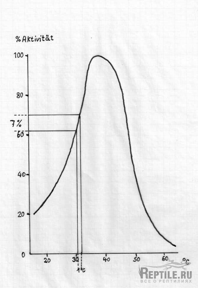 Das Diagramm in Abb. 4 zeigt die Temperaturabhängigkeit eines Enzyms. Bei einer Temperaturdifferenz von 1 °C tritt eine Änderung der Aktivität um 7% ein; der Stoffwechsel ist also sehr sensibel. Für die Eidechsen geht es ums Konstanthalten der Temperatur um 1 bis 2° in der bevorzugten Temperaturzone . Das überrascht bei einem täglichen Temperaturgang zwischen der Nacht mit ca. 18° und dem Tagesoptimum von 31°. Bei einer Ueberschreitung dieser Temperatur steigt der Stoffwechsel weiter steil an. Das wird versucht zu vermeiden, es ist aber erträglich. Es erinnert mich an unsere eigene Situation: 2° über dem Optimum sind 39,5 ° Temperatur (Fieber); der Stoffwechsel ist stark erhöht. In unserem Falle ist das nicht eine Folge der Sonneneinstrahlung, sondern eines pathologischen (Bakterien, Viren) oder chemischen (Pyrogene Substanz) Prozesses.
