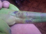 Проблемма начала появляться около недели назад, все время что у нас живет у основания хвоста плотные небольшие бугорки коричневатого цвета в колличестве 2-3, потом вдруг выже них и кзади появилось 2 мокнущих пятна зеленовато голубого цвета, сейчас потемнели ближе к черному, размер около 3мм.