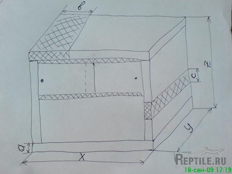 Если б я помнила! А подогнать - элементарно все. Допустим, толщина стекла = a, ширина полос вентиляции b и c (верх и бок соответственно), а размеры предполагаемого террариума - X на Y на Z (длина Х глубина Х высота соответственно). Таки образом, если использовать примерно такую же конструкцию, как у меня, т.е.