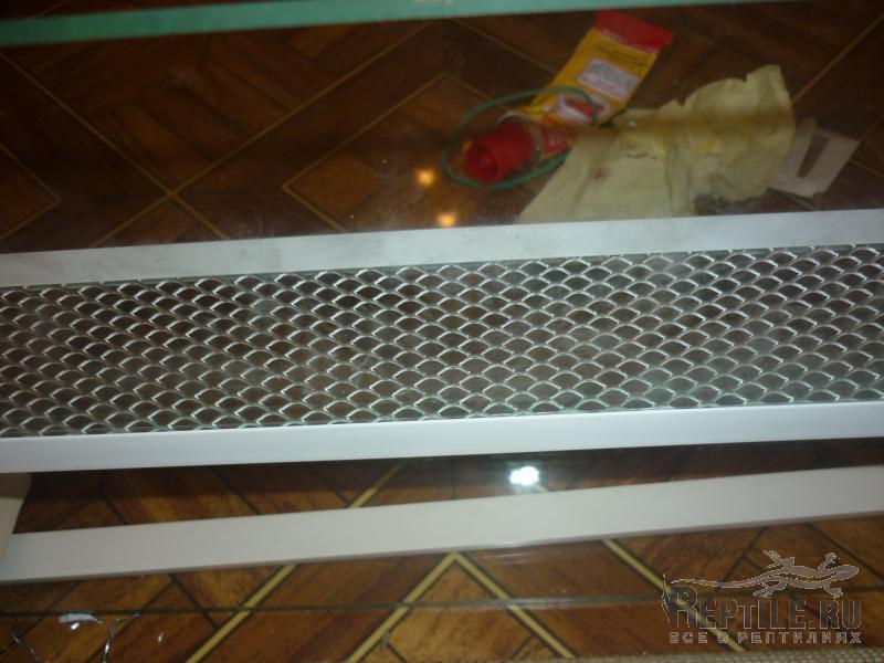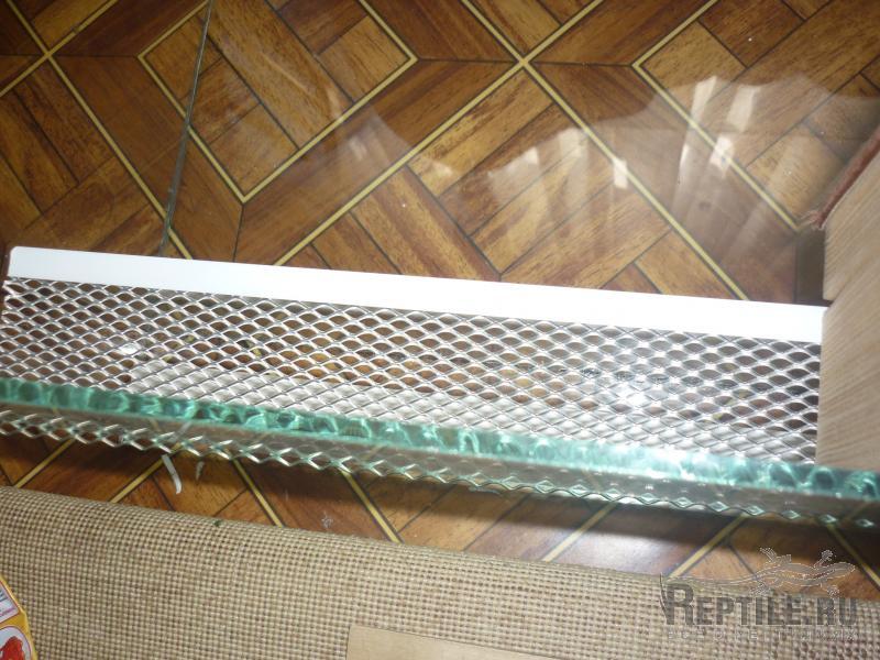 допустив глобальную ошибку отодрал уже хорошо застывшие пластиковые уголки и нижнюю полоску поднял её на +- 5 см выше,взял еще одну полоску стекла и прилепил сетку,отделав её уголками