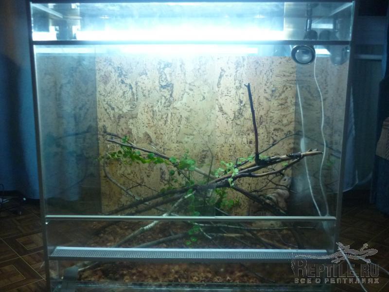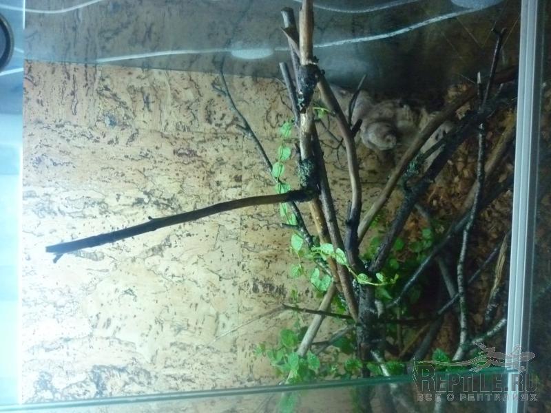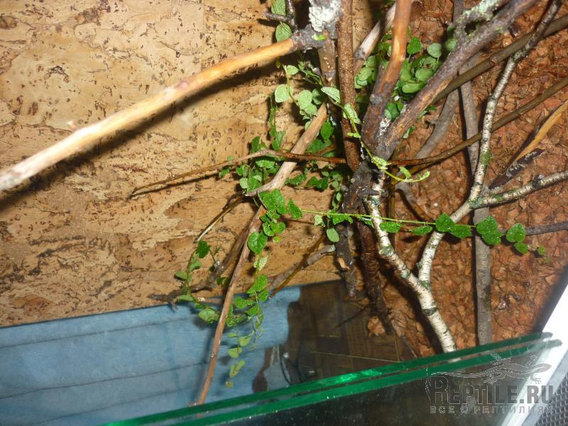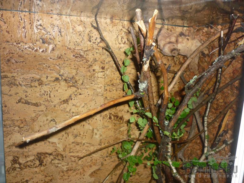 оформляя заднюю стенку террариума переплевался,пришлось сделать из 3х кусков пробкового дерева,поставил каких то сухих веток(крепкие) и туда же в террариум поставил фикус пумилу...