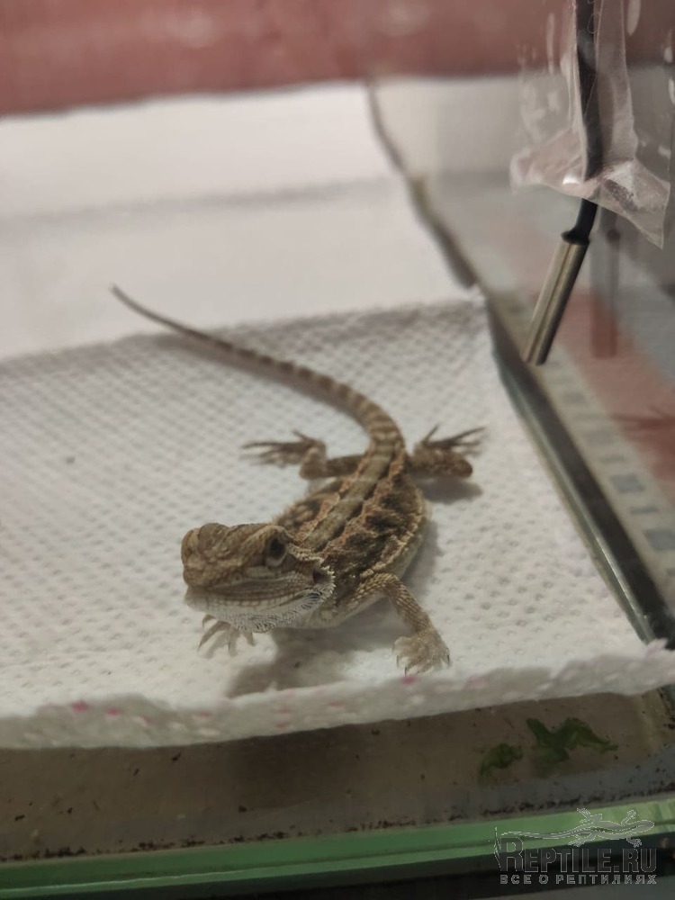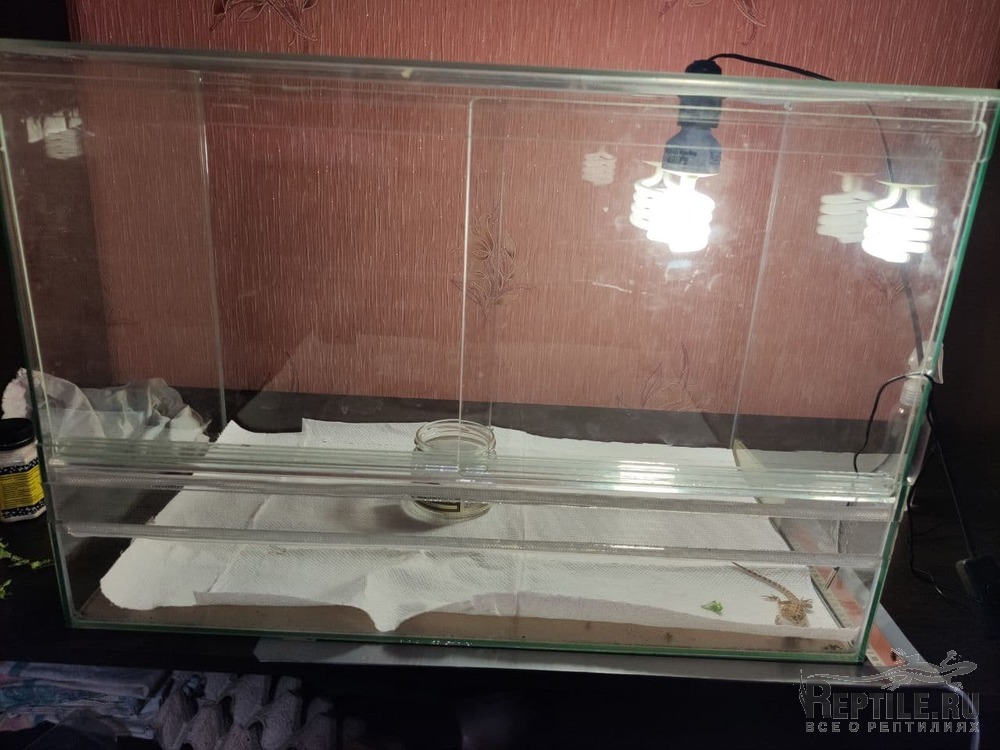 Здравствуйте. Помогите советом. Недавно купили агаменка 1,5 месяца. Поначалу был активный, кушал в апетит туркменских таракашек с кальцием, а после первой линьки перестал кушать. Кормим туркменскими тараканами. Не ест ни зелень, ни живых тараканов - просто не реагирует на еду совсем. 2 дня совсем ничего не ест, позже съела одного таракана и снова голодовку устроила (уже 2й день не ест), воду тоже особо не пъет. Мы ее в теплой воде купали по советам, она посидела пару минут и ушла греться, все время сонная в течении дня, но на действия реагирует, на руках тоже сидит. Вероятность того, что съела субстрат исключена - содержим на салфетках - так как поначалу когда поселили на субстрат она начала на язык пробовать его - и сразу переселили на салфетки. Линять начала где-то через 2 недели как пробыла у нас. Помогите, пожалуйста, идей нету совсем и не понимаем что не так, волнуемся(  Фото агаменка и террариума приложила.