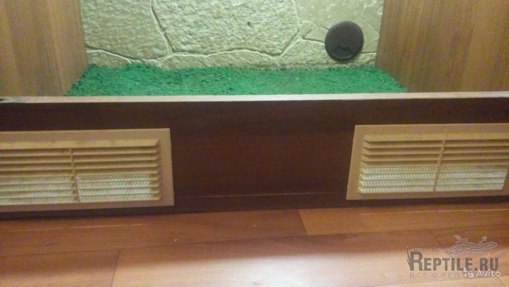 Стеклянная дверца, зеленый ковролин, декоративная стенка, установленный вентилятор (не подключен)