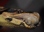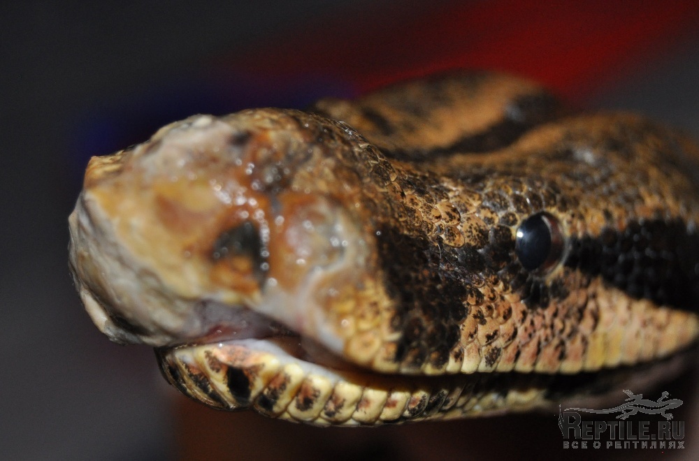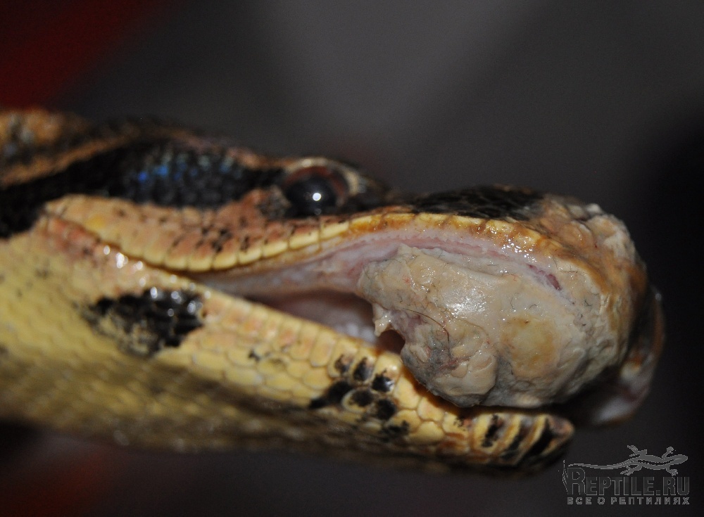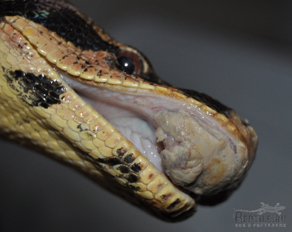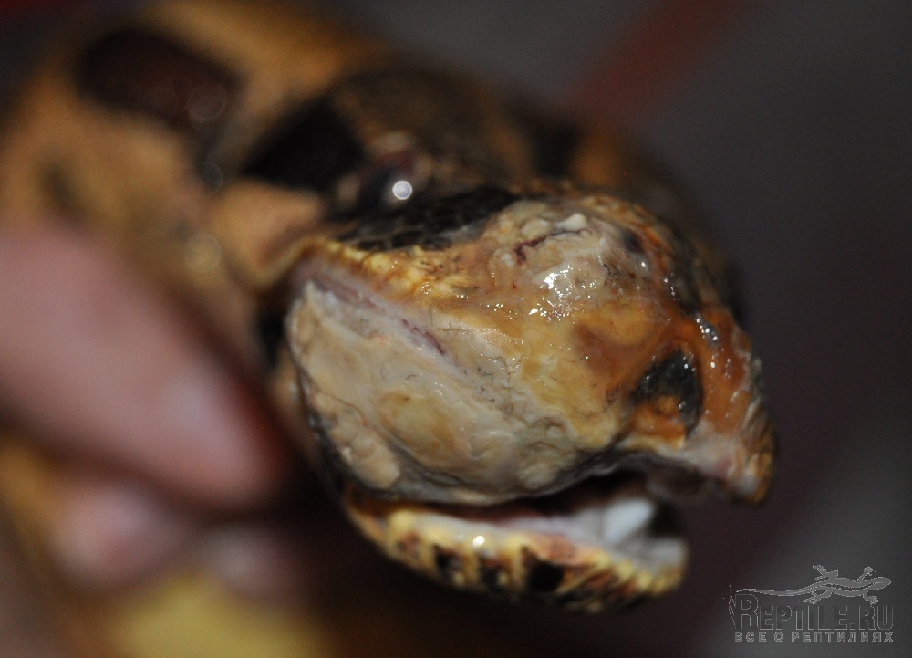 удав(самка, 2 метра, 4 года) хотел перелинять и начала тереться обо все, в итоге о замок и стекло стесала себе нос. образовалась корка и теперь не понятно что с ноздрями. Одна ноздря пробилась, но все равно практически не дышит. А вот правая верхняя челюсть стала опухать. Образуется на ней корка(мягкая), которую видно на фото, если змея ее сдирает то сильно идет кровь. есть подозрение что поврежден зуб или даже часть челюсти, так как заметила что один зубик направлен наружу, из челюсти.пищу брать перестала, до этого не брала из-за линьки. В итоге так и не полиняла, не ела 1,5 месяца и уже 2 недели болеет.