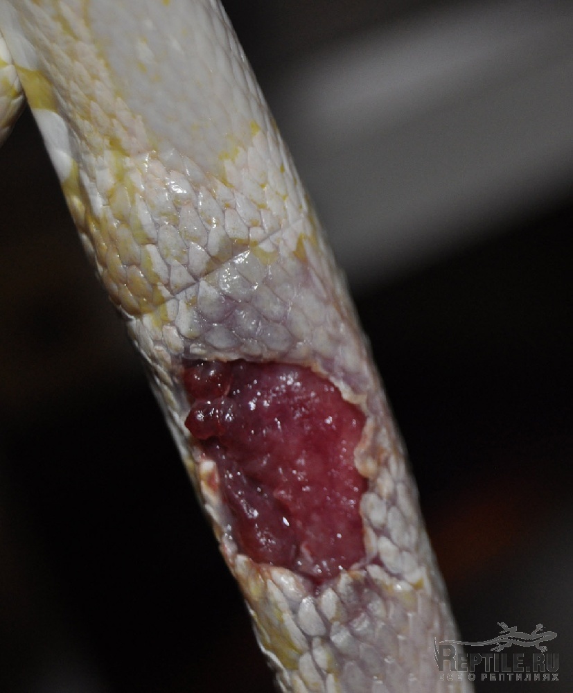 у маисового полоза в ранке постоянно образуется гной. началось все с укуса крысы, но укус был глубокий и ранка сразу загноилась. гной не выходил наружу, образовалась рядом как дополнительная кровеносная система, которая постоянно начала сильно кровоточить, гной постоянно убираем и эта "мясо" постепенно ушло, теперь осталось только огромная рана. Змея активна, ест по расписанию, проблема у нас уже год(прошло уже 8 линек) рана только растет.