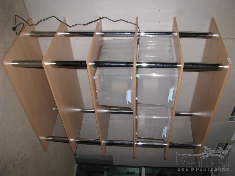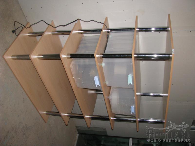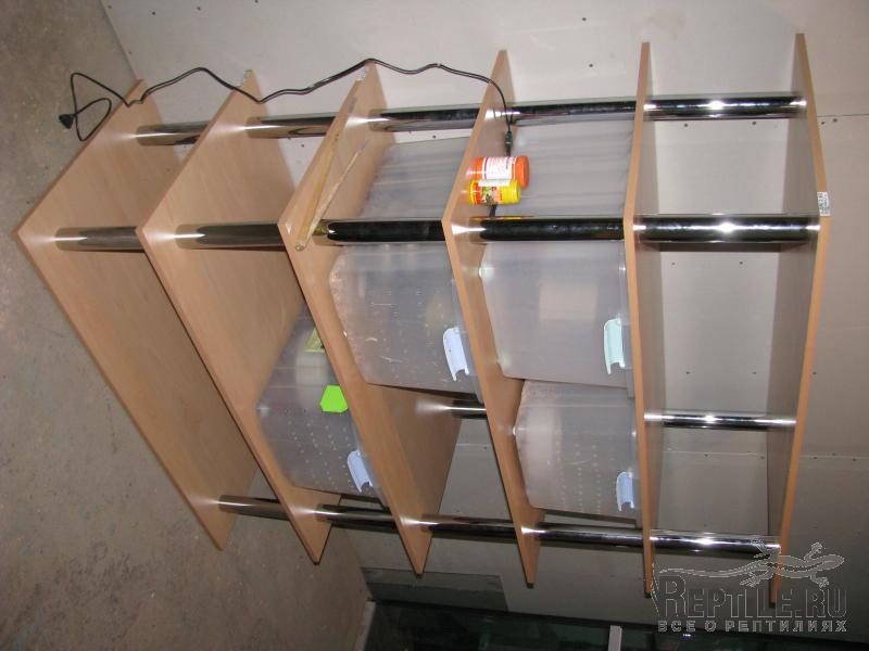 а вот эта стойка уже у меня, собираюсь содержать в ней змей, в основном боид. Под каждым контейнером коврик. Можно сделать углубления (заказать заранее) и уложить туда шнур.