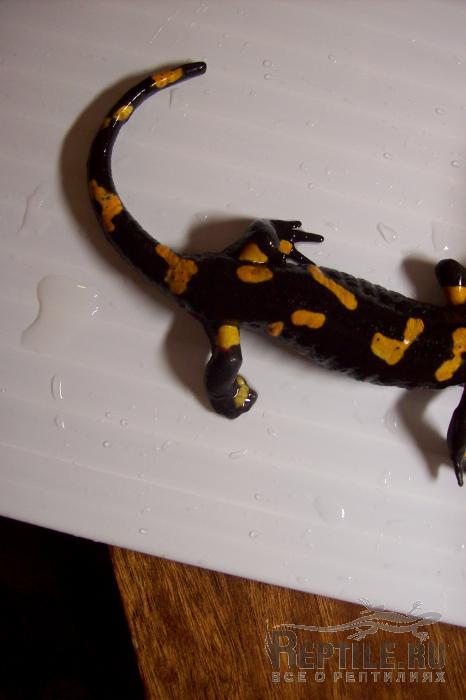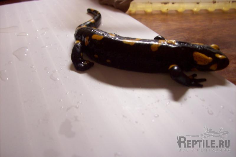 огненная саламандра (я так думаю), попала домой сегодня, размер – 14см. с хвостом, без учета хвоста – 8см. на задней правой лапе нет пальцев. условия содержания до того как ко мне попала - штук 10 в коробке из - под торта, температура - 24-26 градусов, воды на дне 1-2см, корм - черви (так примерно содержалась недели две).