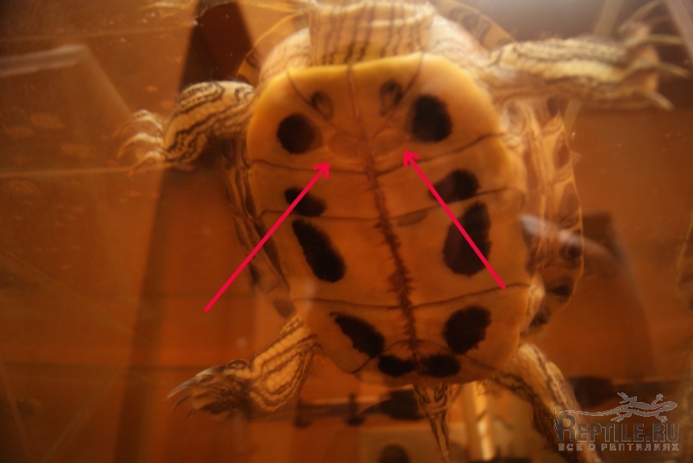 Красноухой черепахе 10 лет, длина 20 см, держу в аквариуме 50 литров, обогрев 25 градусов, фильтр мощный, кормлю креветками, аппетит у черепахи отменный, грунта нет, берег есть. Посмотрите на фото - кажется, что это размягчения.