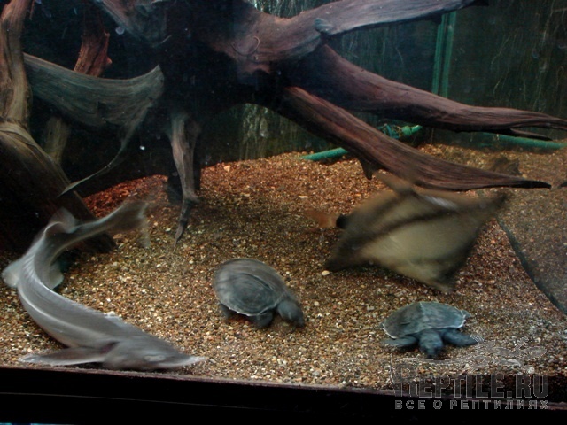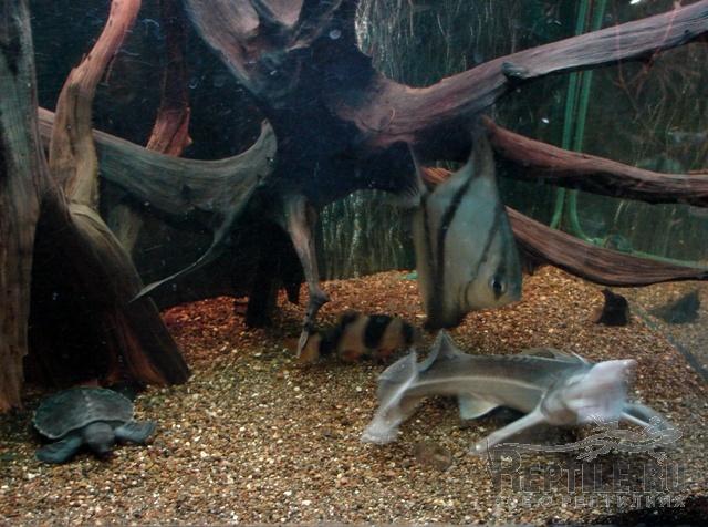 Все конечно красивое,но я когдато держал и разводил дискусов и много знаю о содержании рыб,пока черепашки маленькие все будет нормально .Но по мере роста они будут ,извеняюсь за вырожение,какать все больше и болше.В итоге из за недоеденой пищи и из за кала будут скачки нитратов и нитритов ,притом вода может быть кристально чистой.Рыбы гибнут восновном из за перебоев электро энергии ,отключаються фильтры и воздухокомпрессоры.Рыба быстро задыхаеться.Живут с черепахами хорошо только лобиринтовые:различные гурами и змееголовы.