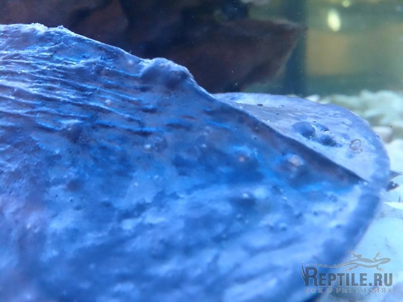 Черепашку поселили в недавно запущенный аквариум. Наросты, возможно, стали появляться одновременно с появлением зеленых и бурых водорослей в банке (на панцире тоже немного были, потом исчезли). В общем сейчас панцирь чистый, но с наростами. На лапах, шее и голове никаких пятен и прочих аномалий не заметно. Сама черепашка активная, с соседями не конфликтует, питается грушей и креветками.