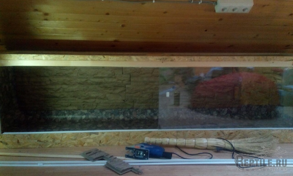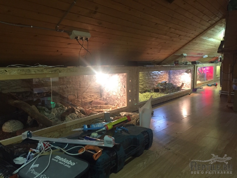 В каждом террариуме есть две точки обогрева, бассейн и большое укрытие (делал тоже сам(фото обязательно выложу если получится) Основа террариума фанера. На пол положил линолеум (так легче производить капитальную чистку террариума) В качестве подстилки использую смесь мульчи и дробленой коры дуба (все изначально прокипятил)В зоне обогрева использовал гальку (камни тоже прокипятил) Теперь про лампы ( в каждом террариуме ) поставил по 4 лампы ReptiGlo 2шт 8.0 и 2шт 5.0 одна красного спектра 100 ватт и белого спектра 80 ватт.