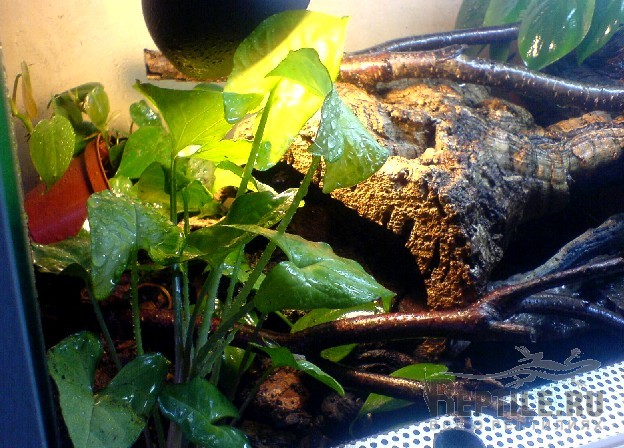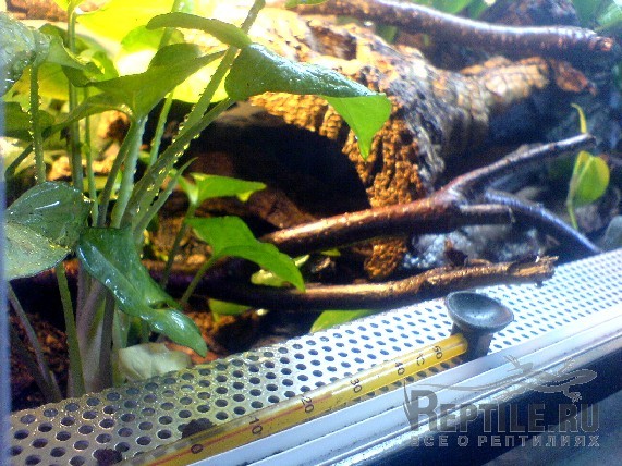 "Наш" водоем - это фирменная большая тяжелая керамическая поилка, она поднята сантиметров на 10 над грунтом. На дне террариума тоже был сфагнум, поначалу, но потом "стоптали-перекопали" в такую более-менее однородную массу, которая лично мне нравится больше, чем отдельно куски мульчи и отдельно ветки сфагнума.