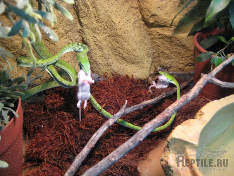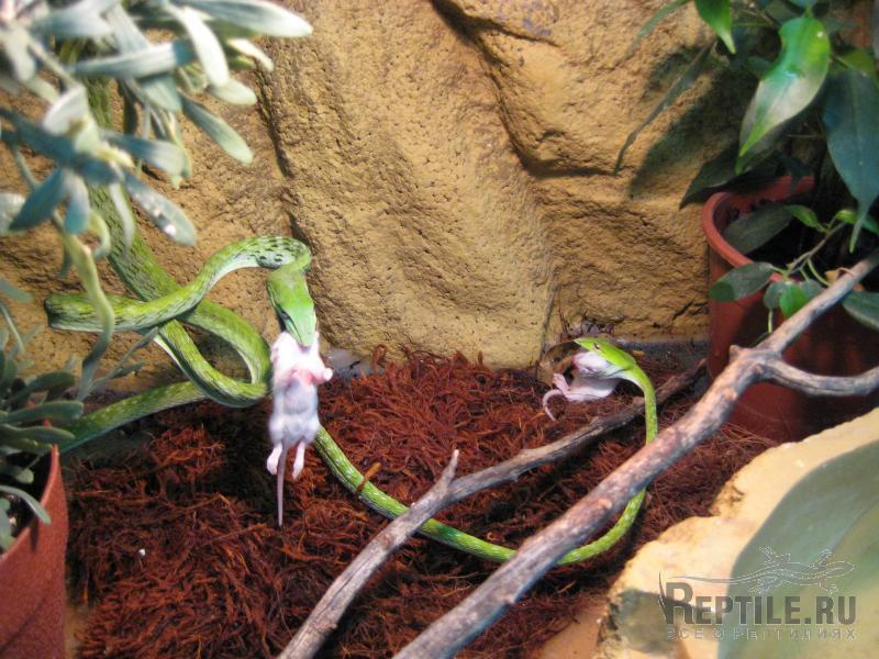 Описываю, тем более что и мотивировка дачи таких "волосатых" с этим связана. Предлагал голышей - реагировали на движение, но было приближение головой к мышонку - и отдергивание, предполагаю, что не нравился запах. На голод брать не мог, принял животных после почти трехмесячного прозябания на скудном пайке, к тому же пересушенных: бОльшая из двух была вся в сухих клочьях неслинявшей шкуры, хуже всего - с неслинявшими "очками". Если бы вы знали, brothers keepers, какое "очко" было у меня, когда я их снимал после двухсуточного замачивания змеи до ноздрей при 29 С, до сих пор считаю, что мне просто повезло. Следующая линька чистой тоже не получилась, но на сей раз змея самостоятельно облиняла голову, еще раз замачивание - и первый раз в терре оказались две нормальные внешне плетевидки. В течение шести недель кормил до отвала, аккуратно облучал на солнце, короче - привел в норму.